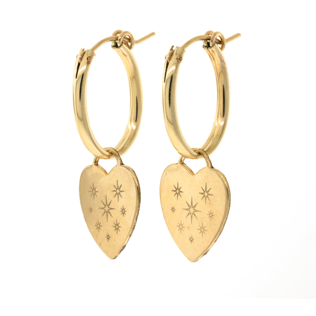 Our new hand-stamped Sparkly Heart Charms paired with our small oval hoops. Wear them solo or add the hearts for a customizable look.