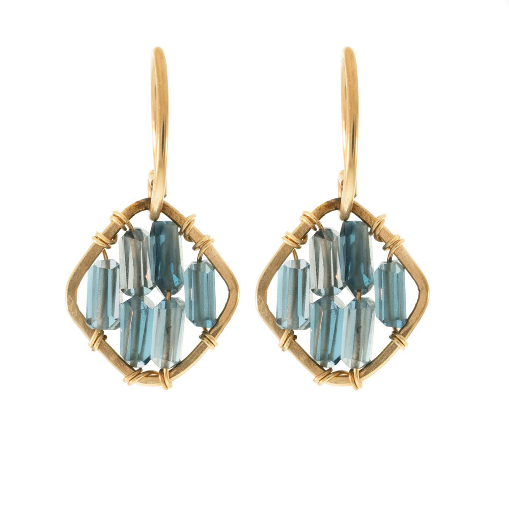 The XS Dominique Drops. Earrings with a hand-formed gold frame, wire-wrapped around a cluster of raw gemstone cylinders — small enough to wear every day, constructed well enough that people lean in to look closer. That's the whole point.